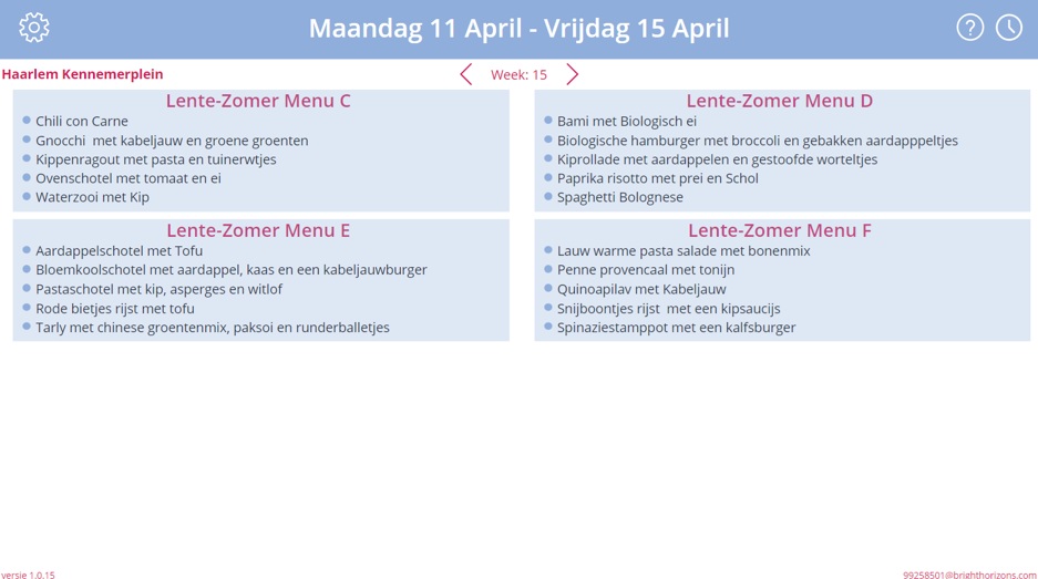 Deze app is ontwikkeld voor een kinderdagverblijf organisatie. De app moet helpen bij het maken van het weekmenu per kinderdagverblijf. Per week zijn er verschillende menu’s beschikbaar waar uit gekozen kan worden. Elk menu bestaat uit 5 maaltijden zodat er elke dag van de week een andere maaltijd kan worden gekozen. De menu’s kunnen per week of per periode worden aangepast. Je kunt vervolgens per dag aangeven hoeveel kinderen er mee eten en op basis van aantal kinderen en benodigde ingrediënten worden de juiste producten op het boodschappenlijstje geplaatst