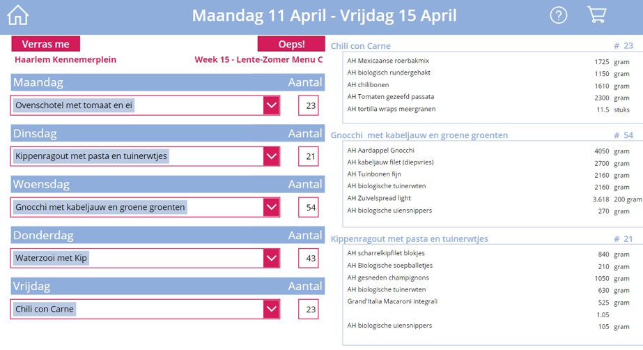 Nadat je een menu hebt gekozen kun je de verschillende maaltijden verdelen over de verschillende dagen. Je kunt dit zelf per dag selecteren of via de knop ‘verras me’ automatisch laten vullen. Nadat je de verschillende aantallen hebt aangegeven verschijnen links de benodigde ingrediënten en aantallen die nodig zijn. Wil je overnieuw beginnen druk je op de knop ‘Oeps!’. Als je op het winkelwagentje klikt komt jij bij het boodschappenlijstje. In deze versie worden de boodschappen nog niet automatisch besteld.